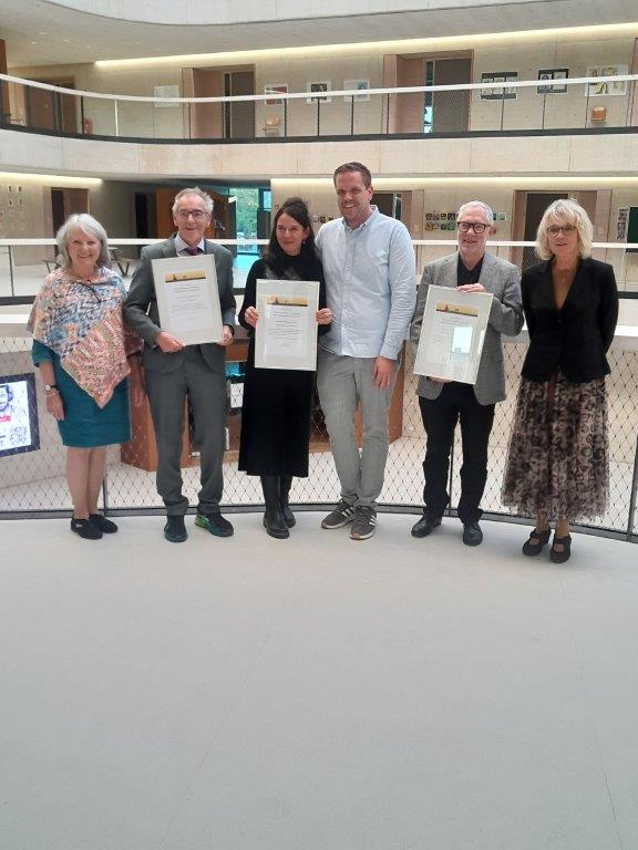 Dorothea Hartmann, Ulrich Steenberg, Tanja Pütz, Simon Steffels, Franz Hammerer und Maria Kley-Auerswald (v.l.n.r.) auf der Preisverleihung der Stiftung Montessori in Köln (die Preisträger:in mit den Laudator:innen)
